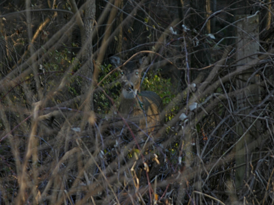 I want a picture of my neighbors, something to remind me of their presence. So every morning I take my camera on my walk. The deer have cooperated on several occasions, making enough noise for me to locate them in the woods, holding still long enough for me to find my camera and start shooting. But something always goes wrong: the deer hide in the shadows so the pictures are dark and fuzzy, the camera is on the wrong setting or the battery dies, a car barrels down the road and sends the deer running.