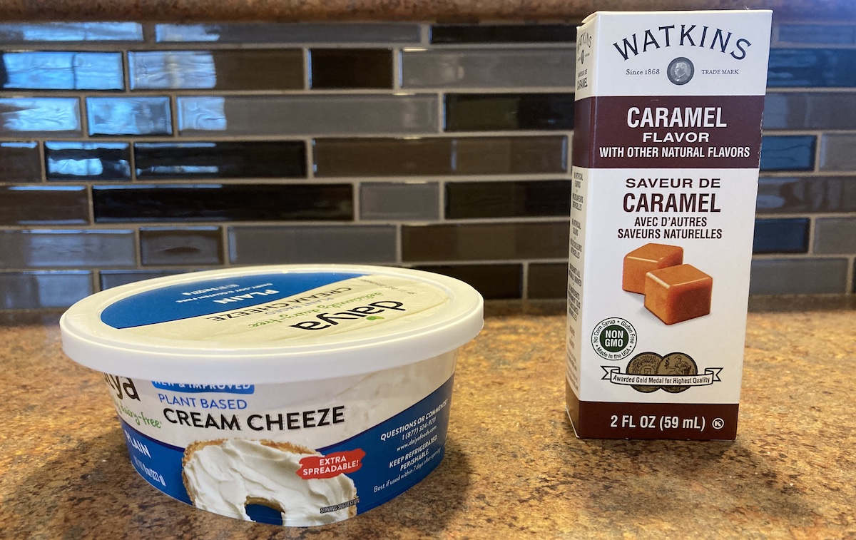 You’ll find the recipe below. Use regular cream cheese if dairy isn’t an issue for you. Use one of the soy-based substitutes if that works at your house. However, you have to use Watkins caramel extract or the flavor superlatives won’t apply.