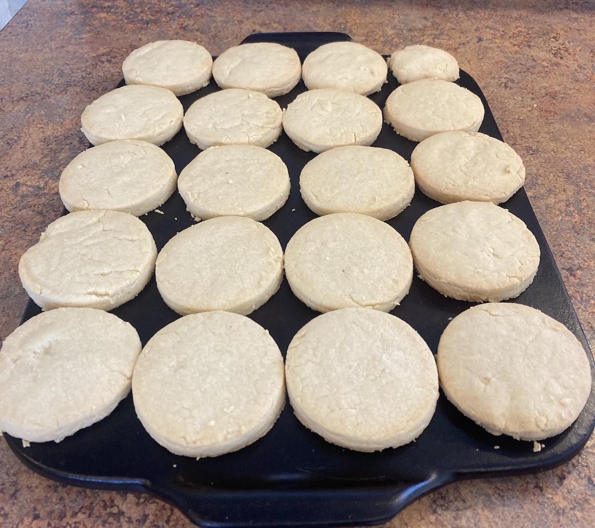 Roll dough 1/3 inch thick on a lightly floured surface. Use a small water glass to cut into rounds. Place 1/2 inch apart on a hot, ungreased baking stone. Bake for about 20 minutes or until set. Remove from stone to cool.